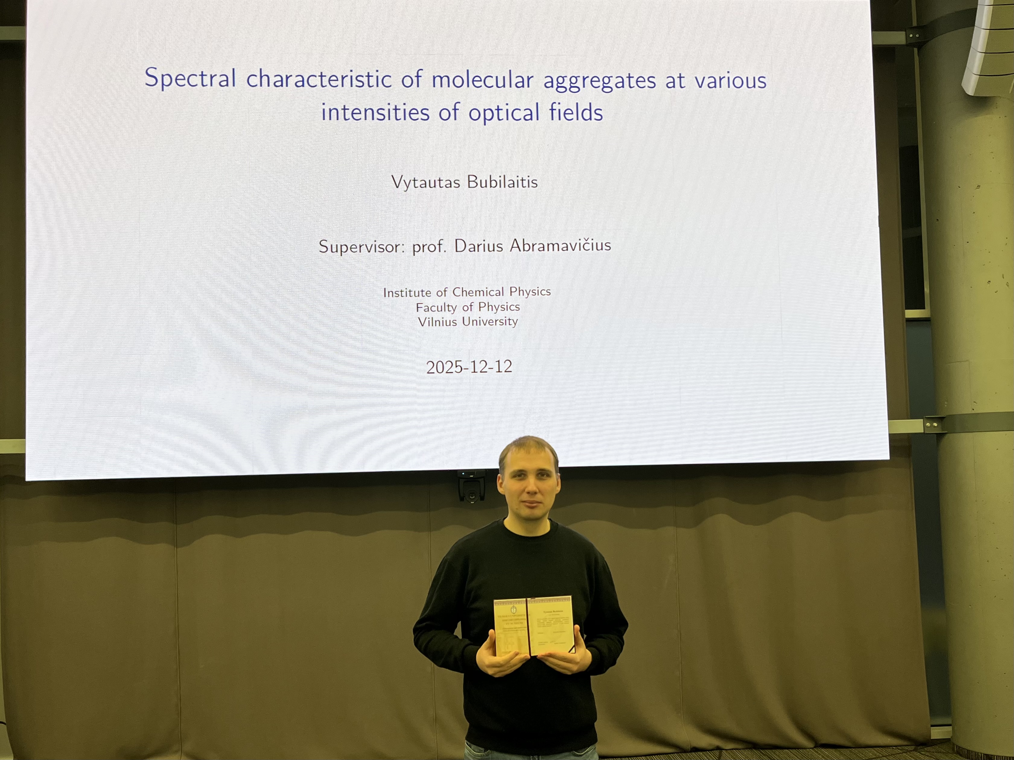 Gruodžio 12 d. Vytautas Bubilaitis apgynė disertaciją „Spektrinės molekulinių agregatų charakteristikos įvairaus intensyvumo optiniuose laukuose“ (angl. „Spectral Characteristic of Molecular Aggregates at Various Intensities of Optical Fields“). Vadovas – prof. dr. Darius Abramavičius.
